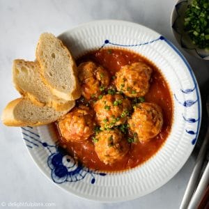This Vietnamese Meatball Banh Mi (Banh Mi Xiu Mai) makes a delicious and filling breakfast or main meal. The pork meatballs are served with a flavorful tomato sauce and crispy banh mi (Vietnamese baguette).
